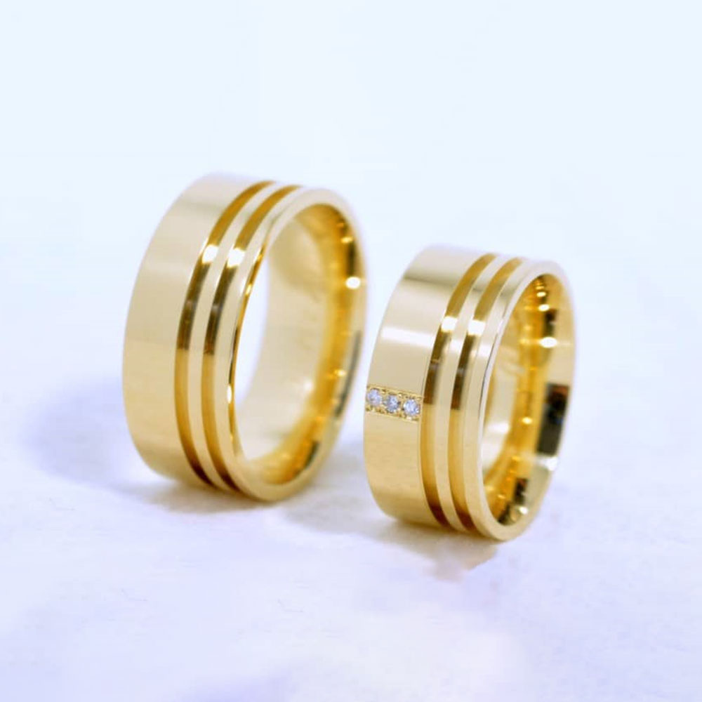 Alianças com Frisos e 3 Diamantes – Ouro 18K
